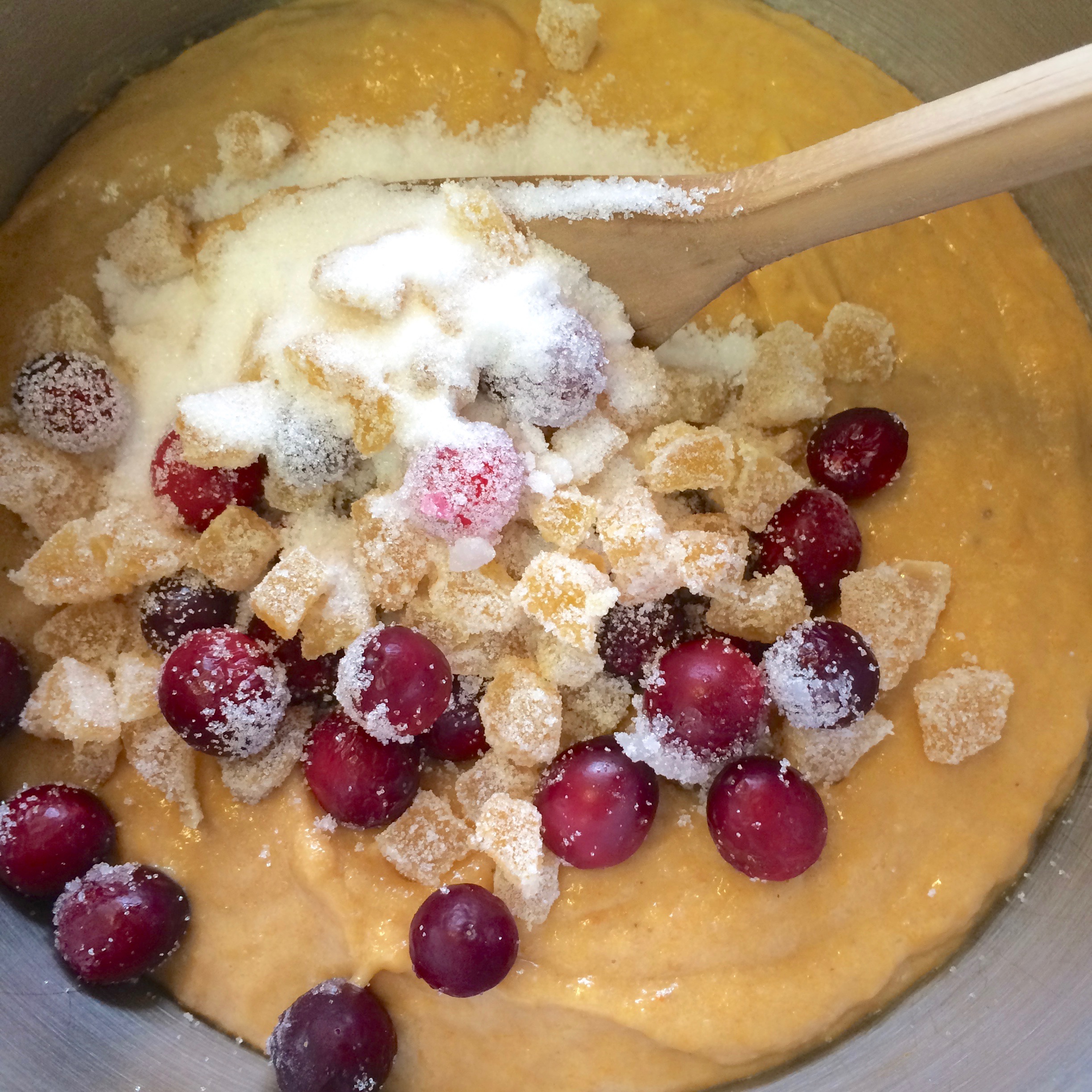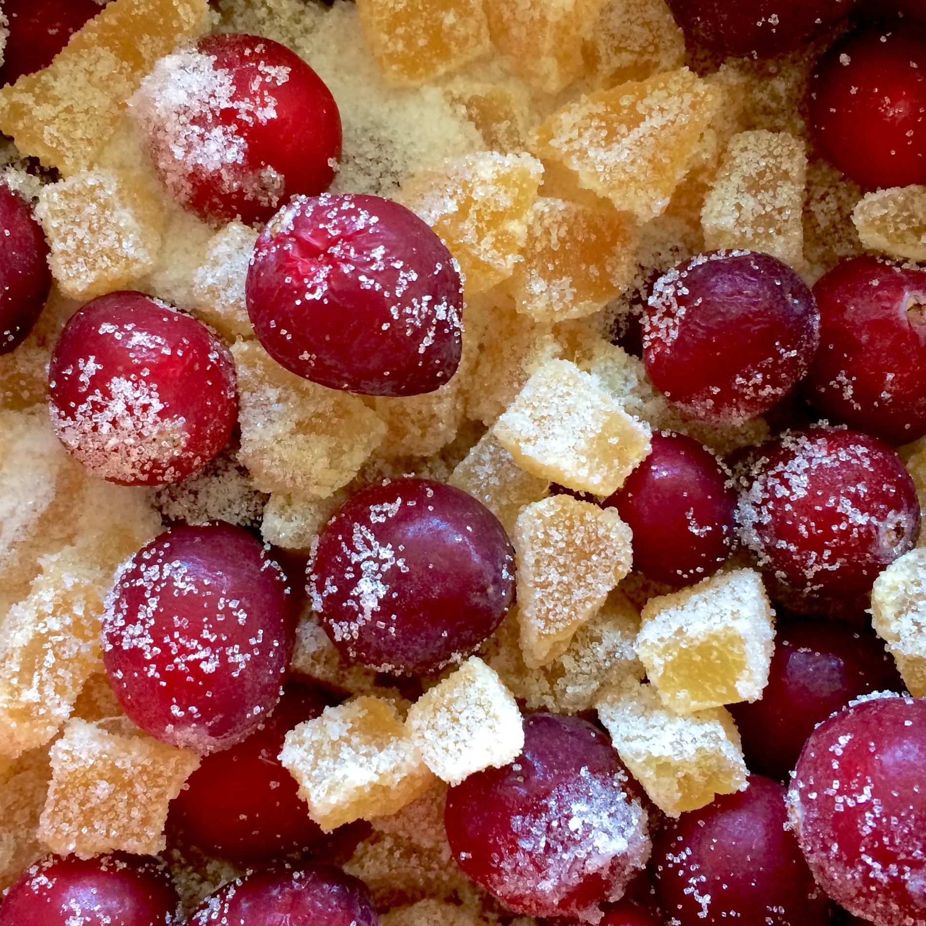 Stir in the sugar dusted ginger and cranberries, along with any loose sugar.