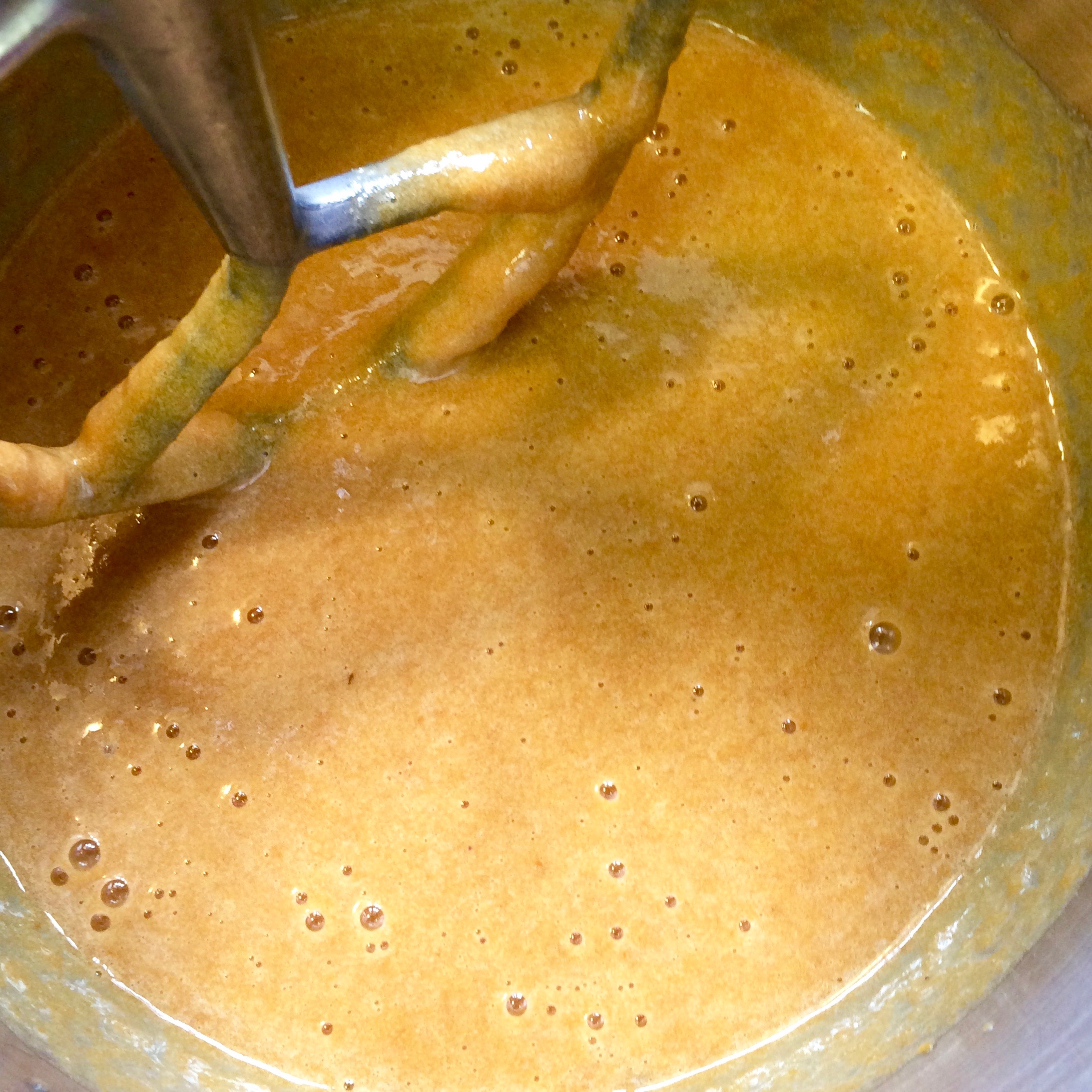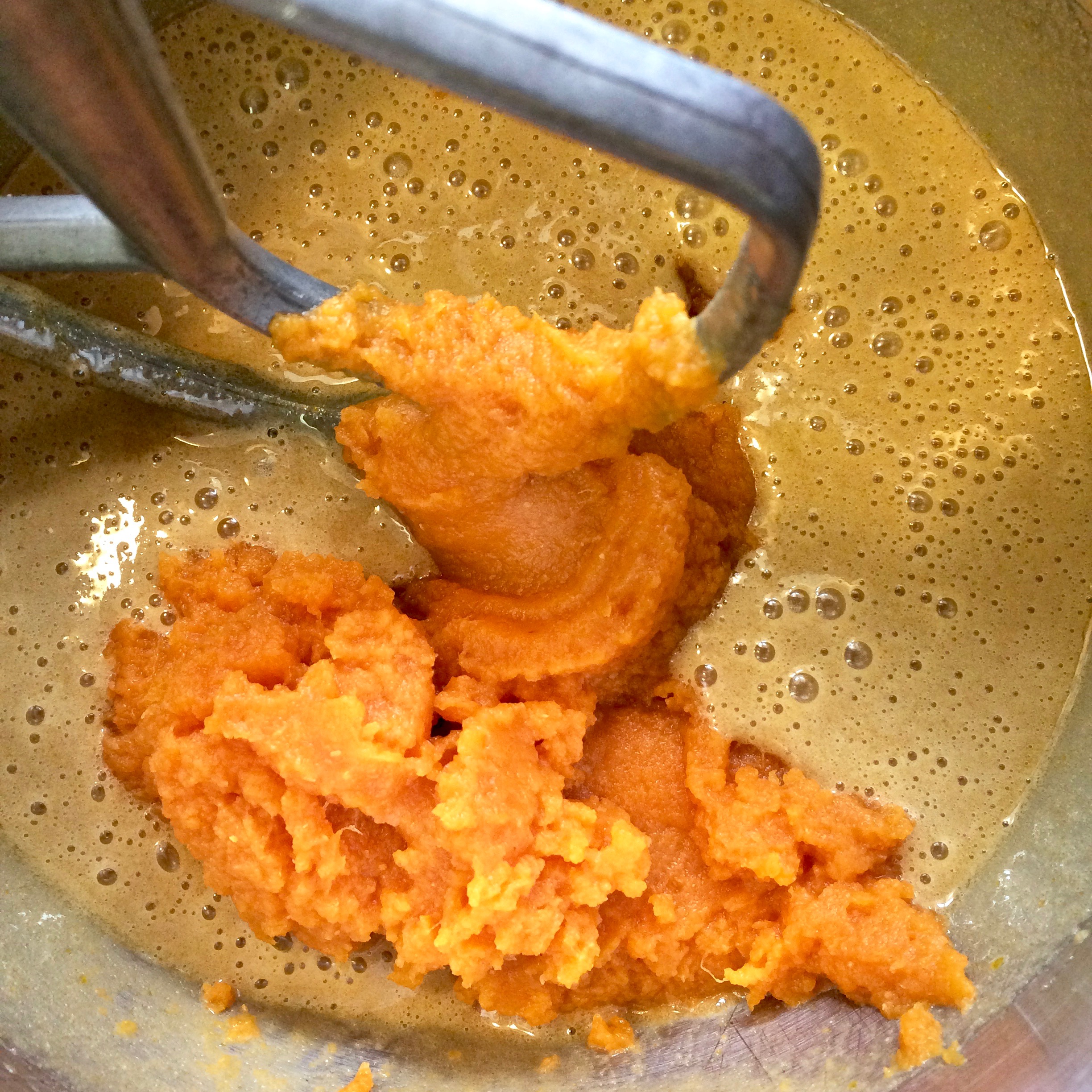 Note: The mixing of the “liquid” ingredients can be done by hand with a whisk, but be sure to completely emulsify the first four of these ingredients before whisking the pumpkin in thoroughly.