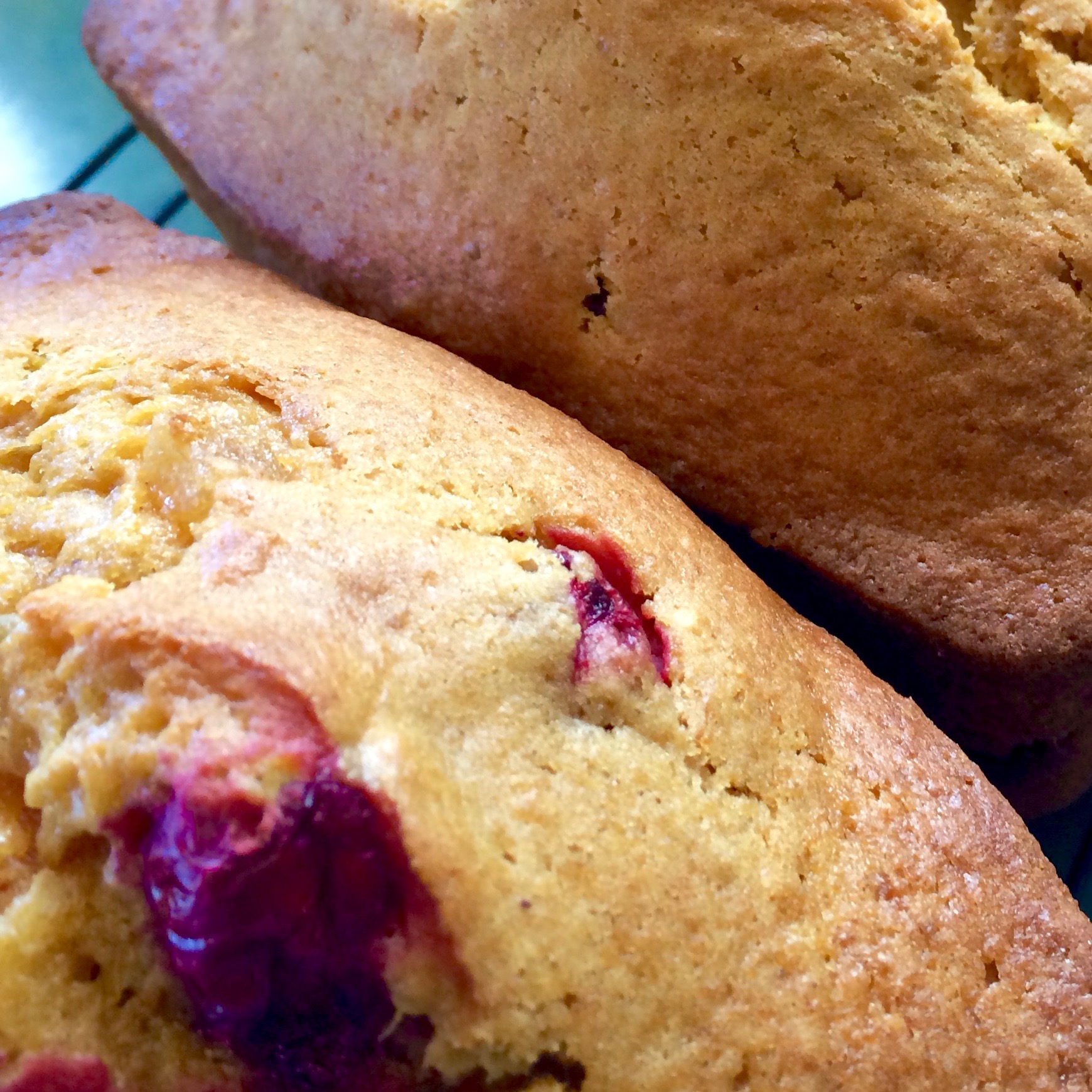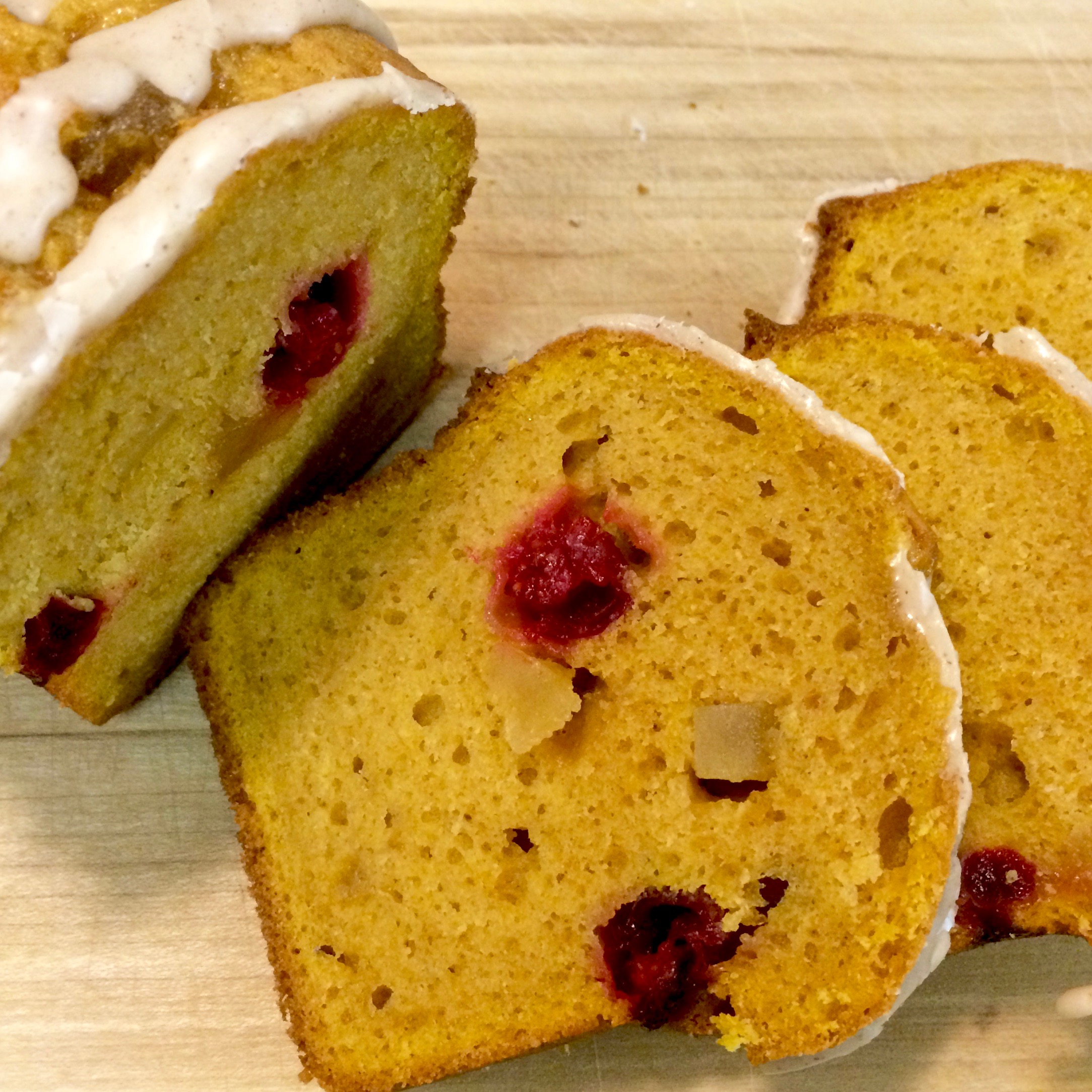 The trees are laden with apples and pears, which desperately need to be picked before the raccoons settle in to eat them all. The oak leaves are starting to show their bold reds, with the maples just starting to have golden crowns. I love this time year, it inspires me to get back in the kitchen to create some new things, and test out some simmering ideas I have. Here’s this week’s offering, a very light pumpkin loaf, studded with bright cranberries and pungent ginger. Drizzled with a vanilla-cinnamon glaze, it slices beautifully, and is perfect for snacking. Enjoy it as you feel the autumn settle in around you, like a well-loved blanket.