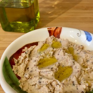To serve: spoon into a small serving dish, and drizzle with olive oil, and scatter with some lemon zest and a pinch or two of pimentón. Serve with plain crackers or crudités.